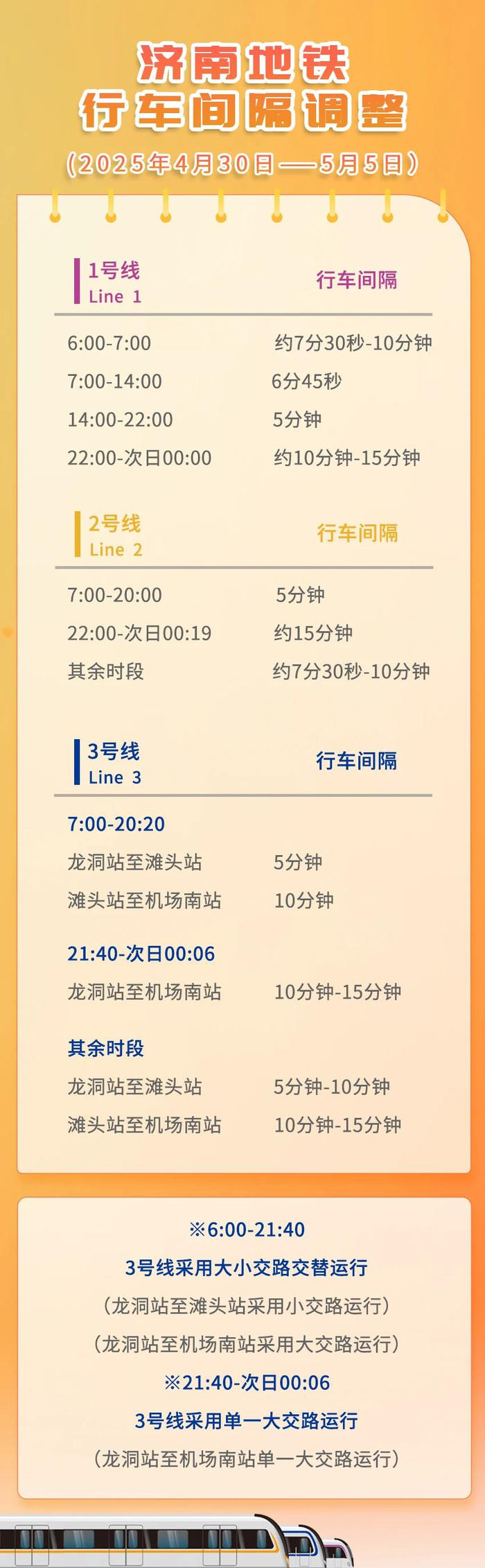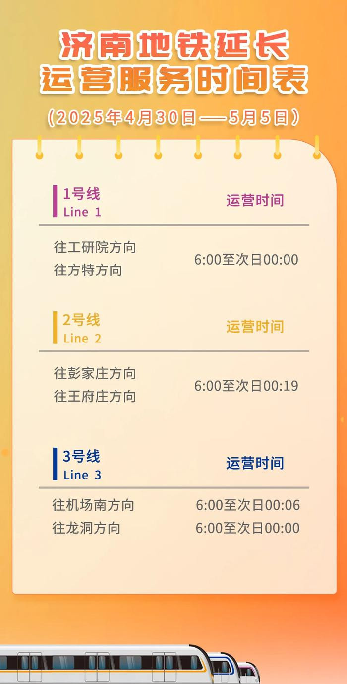 4月30日至5月5日期间,济南地铁列车到发时刻、行车间隔均有调整,请您提前规划出行时间。